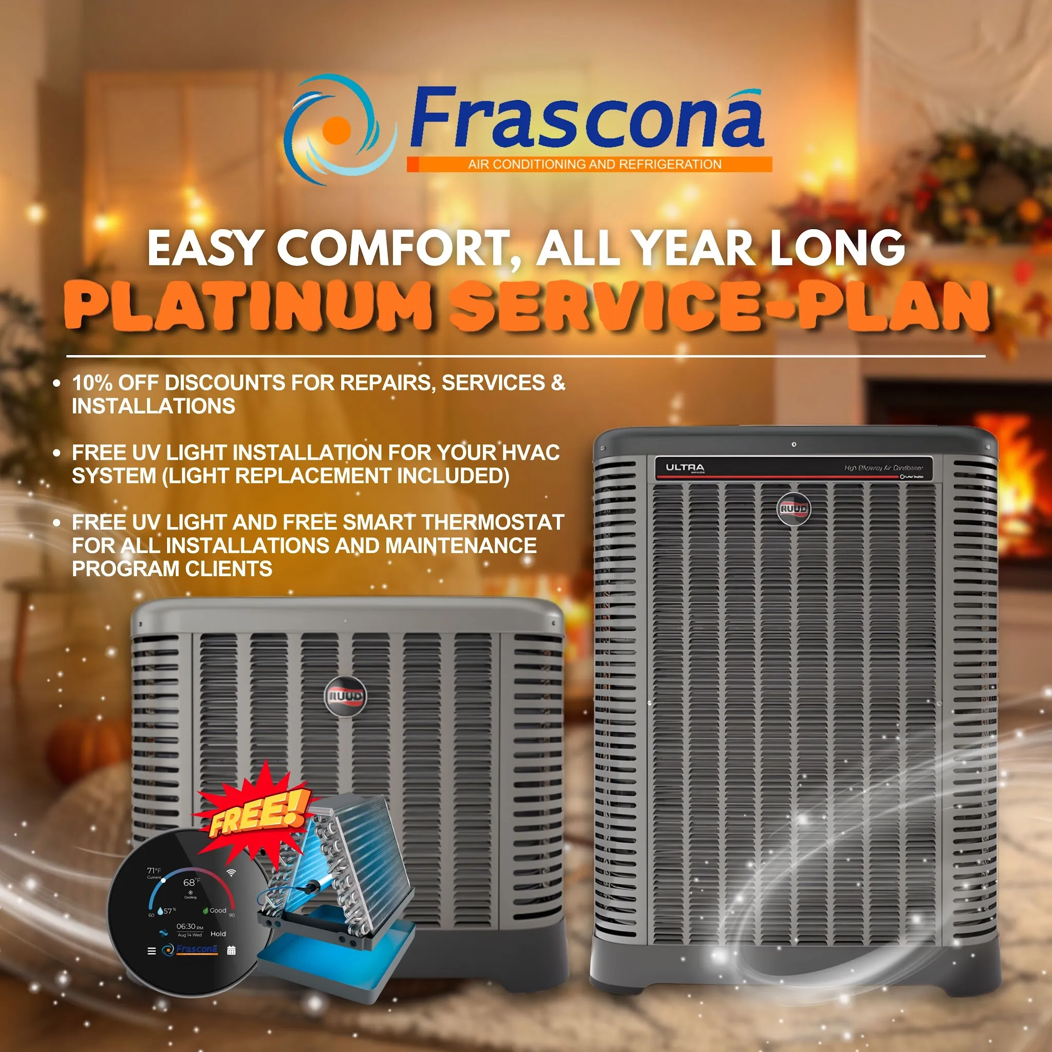 FRASCONA HVAC-R delivers comprehensive heating, ventilation, and cooling solutions. From AC repair to furnace installation, our certified technicians ensure your home stays comfortable and energy efficient.
